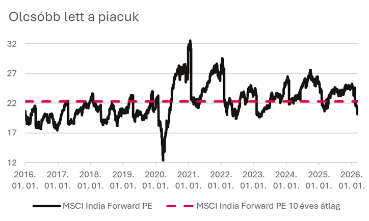 Az MSCI India előretekintő P/E mutatója 2026 elejére egyértelműen mérséklődött, és ismét a tízéves átlag alá süllyedt. Első pillantásra ez meglepő lehet, hiszen az indiai részvénypiac árfolyamszintje nem csökkent, sőt az elmúlt évben növekedést mutatott. Ha azonban a mutató szerkezetére tekintünk, gyorsan kiderül, hogy az „olcsóbbá válás” nem a részvényárak eséséből, hanem a vállalati eredményvárakozások látványos javulásából fakad.