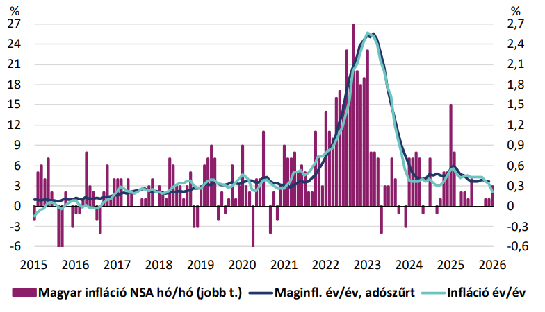 Mivel az inflációs számok a vártnál is alacsonyabbak lettek, ezért éves átlagos várakozásunk az inflációra (amiben már az adat előtt is lefelé mutató kockázatokat éreztünk) már túl pesszimistának tűnik. A februári infláció könnyedén 2% alatt is lehet. Összességében idén a most hivatalosan általunk várt 3,3% helyett több tized százalékponttal lejjebb lehet az éves átlagos drágulás mértéke. Ősztől ismét 3% feletti inflációs számok valószínűsíthetőek, de sok múlik azon, hogy milyen költségvetési lépések lesznek az év második felében a választásokat követően, illetve az árrésstopok kivezetése milyen módon és milyen ütemezésben valósul meg, ha megvalósul egyáltalán. A friss kormányzati bejelentés szerint az árrésstopok további három hónappal, május végéig meghosszabbításra kerültek, ami a következő hónapokban segíti az infláció alacsony szinten való stabilizációját.