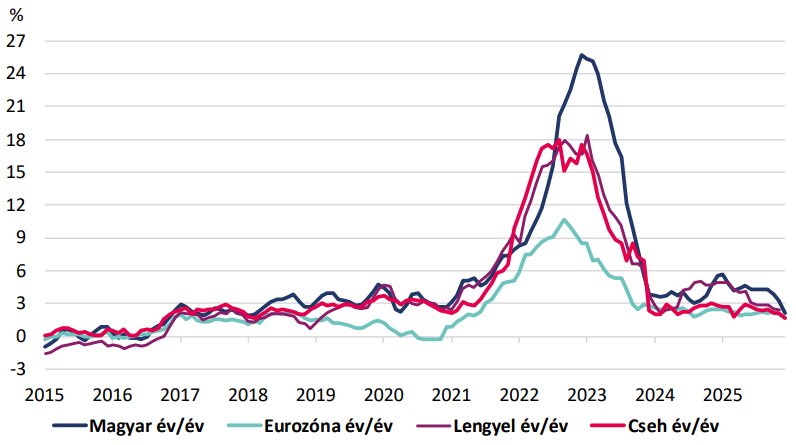 Az infláció nemcsak az MNB inflációs célja alá, de a célsáv alsó széléhez közelített az év első hónapjában. A két legnagyobb kategóriát tekintve is kedvező folyamatok vehetők ki: az éves élelmiszerinfláció 2024. júniusa óta nem volt olyan alacsony (1,3%), mint most, miután folytatódott a húsfélék és tejtermékek árának mérséklődése és a piaci adatoknál sem voltak láthatóak érdemi áremelések az év első heteiben. Fordult a trend a szolgáltatásoknál is, a decemberi megugrást követően a szolgáltatások árnövekedése (5%) már több mint négy éve nem látott szintre jött le.