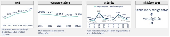 Idén január és október között a turisztikai szálláshelyeken regisztrált vendégek száma jelentősen emelkedett: a belföldi turistáké 3%-kal, míg a külföldieké 11%-kal haladta meg az előző év azonos időszakának értékeit. Így tehát továbbra is jól látható, hogy a külföldi turisták jelentik a növekedés fő hajtóerejét. Októberben mind a külföldi, mind a belföldi vendégforgalom, valamint a vendégéjszakák száma is növekedést mutatott havi és éves szinten is. A bruttó árbevétel is kiemelkedően bővült, a 104,2 milliárd forintos októberi adat folyó áron 14%-kal haladta meg az egy évvel korábbit. Az ágazat bruttó hozzáadott értéke folyamatosan erősödik, ami a szektor gazdasági teljesítményének dinamikus javulását jelzi. Szintén pozitívum, hogy az idegenforgalomban működő vállalatok számának hosszú időszak óta tapasztalt csökkenése megállt, és kismértékű növekedés történt 2024 decemberéhez képest a harmadik negyedév végére. Az idegenforgalom bővülésének folytatódására számítunk 2026-ban is, összhangban a nemzetközi trendekkel. A hazai növekedést több tényező is támogatja: a reálbérek emelkedése, valamint az olyan juttatások, mint a családi adókedvezmény fokozatos megduplázása, illetve a két- és háromgyermekes édesanyák személyi jövedelemadó-kedvezménye.