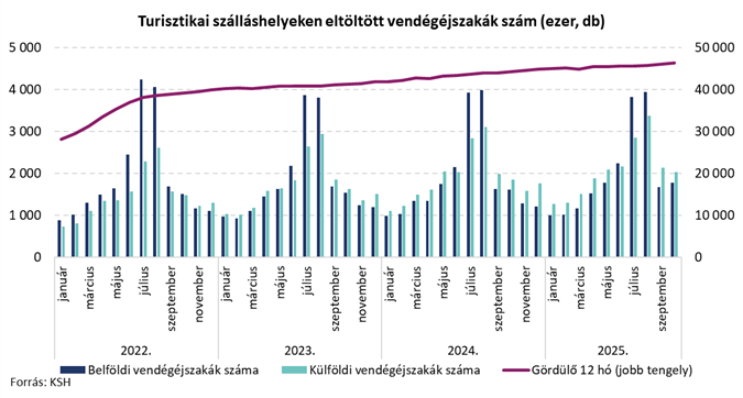 • 2025 októberében is jól teljesített a turizmus szektor: 1,7 millió vendég 3,8 millió vendégéjszakát töltött el. A vendégek száma összességében 11, a vendégéjszakáké 10%-kal nőtt a turisztikai szálláshelyeken az egy évvel korábbihoz képest.