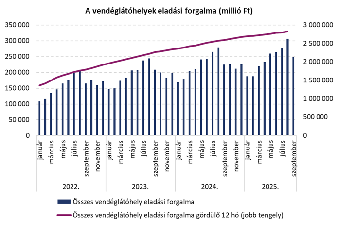 • Vendéglátás: A vendéglátóipar is növekedni tudott az év első kilenc hónapjában, így 5%-kal haladta meg a forgalom az előző év hasonló adatát. A vendégéjszakák számának növekedéséből leginkább azok a vendéglátóegységek profitálnak, melyek elősorban a külföldi vendégekre szakosodtak (Budapesten). A fogyasztók árérzékenysége 2025-ben is meghatározó. Idéna minimálbér és a garantált bérminimum emelkedésének kitermelése jelent feladatot a szektor számára, de nemcsak a bérek okoznak kihívást, hanem munkaerőhiány is komoly gondot jelent. Másrészről amennyiben a gazdasági környezet kedvezően alakul és a bizalomhiány oldódik, a reálbérek növekedése az éttermek forgalmának bővülését is segítheti. A vendéglátóhelyek száma 2020 óta csökkenő trendben van, 2025 első félévében 42.332 működött, ez 4%-os csökkenést jelentett egy év alatt.