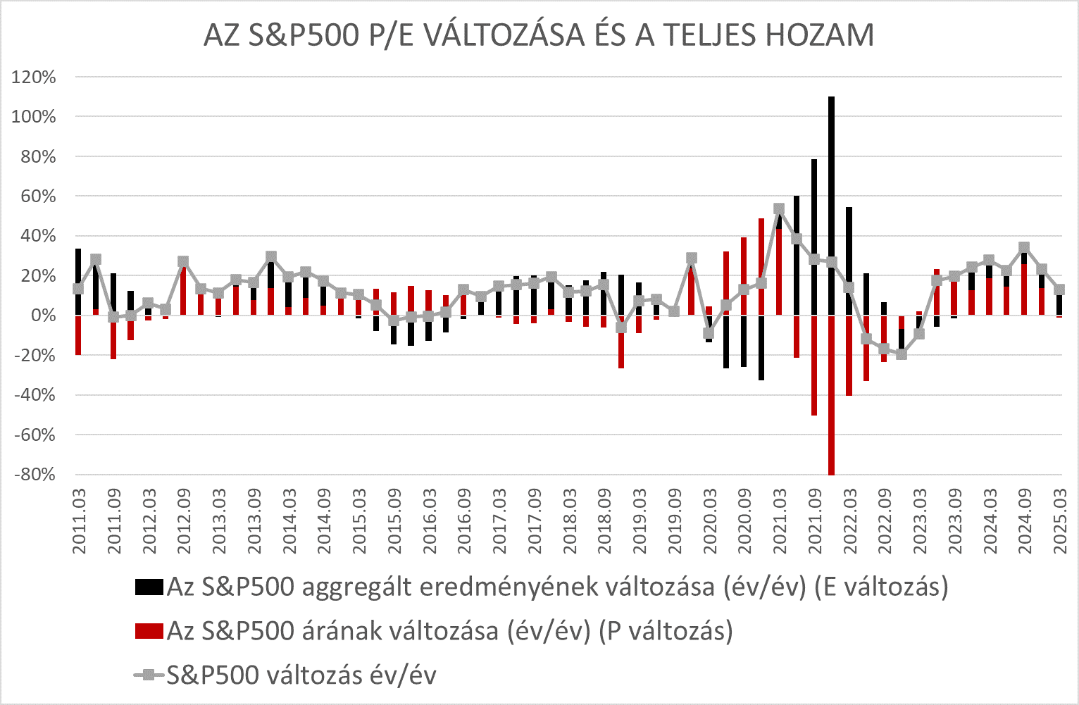 Az USA esetében igaz, hogy év/év alapon 13%-kal emelkedhet az aggregált vállalati eredmény 2025 Q1-ben (az ezt bemutató jelentések majd április első hete után érkeznek). Ehhez képest az S&P500 index annyira nem néz ki jól, sőt akár az 5400-as szint is elképzelhető az előttünk álló hónapokban.