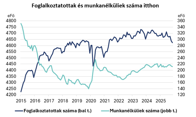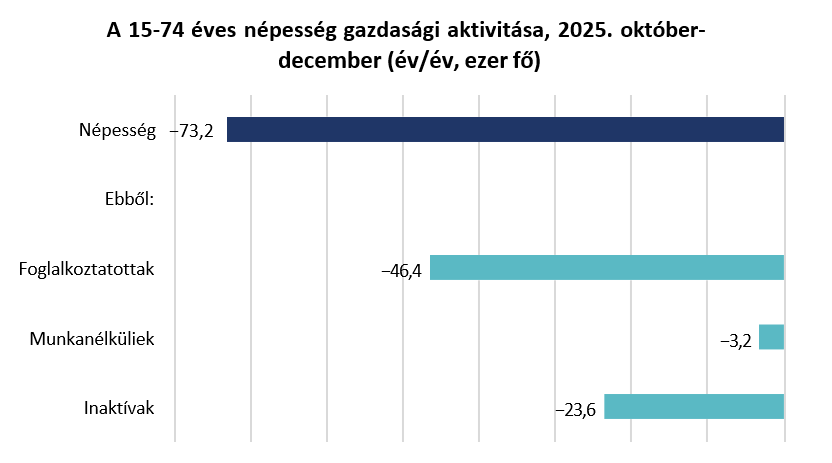 2025 utolsó két hónapjában látványosan csökkent a foglalkoztatottak száma idehaza, az egyetlen pozitívum az lehet, hogy a visszaesés mértéke valamelyest mérséklődött decemberben. Kedvezőtlen továbbra is, hogy a gazdaságilag aktívak száma (vagyis a potenciális munkaerő-állomány) 15 ezer fővel jött le. Az aktivitási ráta a novemberi jelentős mérséklődés után 0,1 százalékponttal 67,8%-ra csökkent decemberben. Egyelőre nem látható tehát az, hogy a munkanélküliségi ráta növekedne, mivel az inaktivitás (legalábbis annak aránya) növekszik. Egyre erősebb korlát a lakosságszám csökkenése: a 15-74 éves korú népesség decemberben is csökkent, a népesség fogyása és elöregedése már most is láthatóan korlátozza a foglalkoztatást. 2025 utolsó három hónapjában – az előző év hasonló időszakához képest – a népesség több, mint 70 ezer fővel csökkent. Ebből több, mint 40 ezer főt a foglalkoztatottak esése tett ki, de az inaktívak száma is esett közel 24 ezer fővel, és a munkanélküliek száma is minimálisan mérséklődött, 3 ezer fővel. A demográfiai folyamatok tehát egyértelműen negatívan hatnak a foglalkoztatási folyamatokra. A fiatalok és az idősek foglalkoztatásának növelésével ezen talán lehetne valamit ugyan segíteni, de a népesség fogyásából adódó hatásokat ezzel is csak kismértékben lehetne kompenzálni.