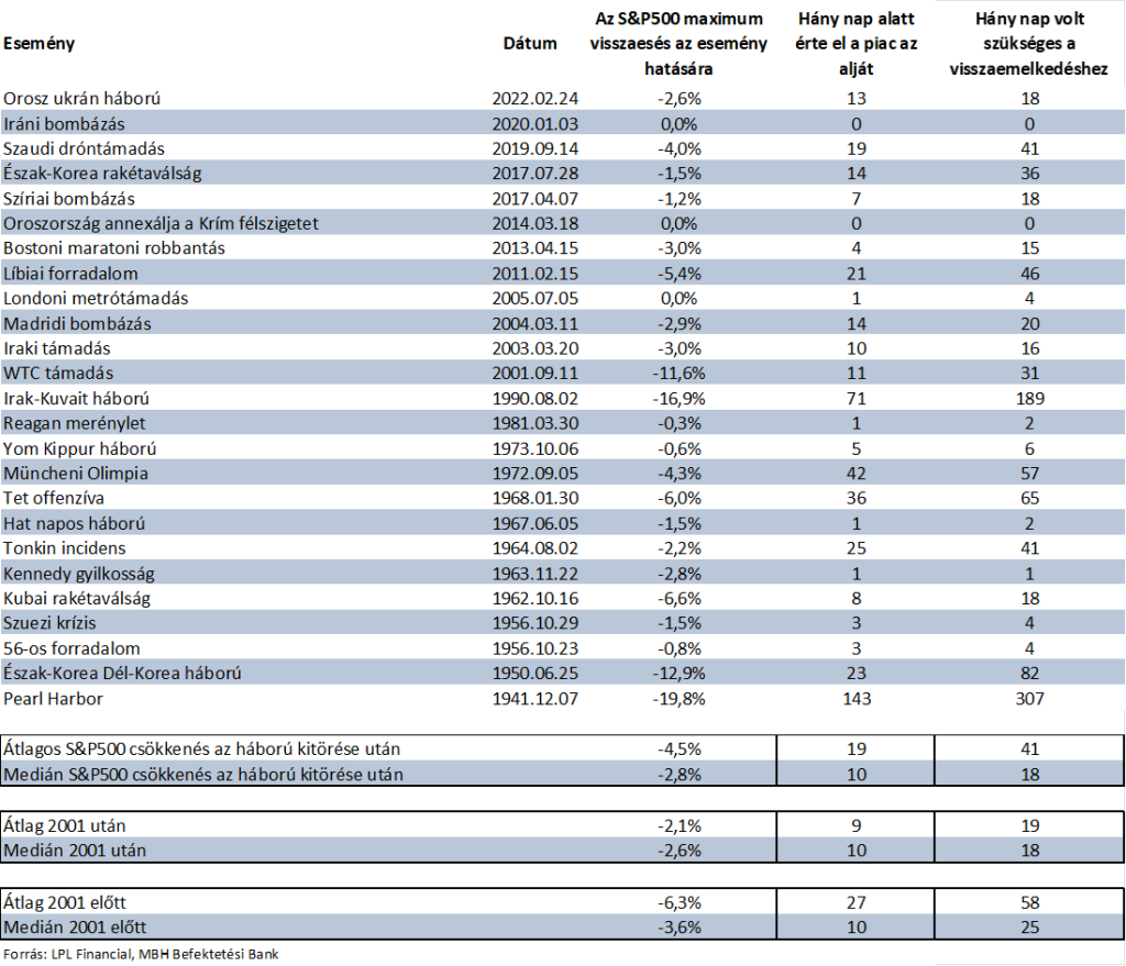 Aki pedig az átfogó statisztikákat szeretné böngészni, annak itt lentebb azt elmúlt évtizedek legfontosabb konfliktusait foglaltuk össze. 2001 után láthatóan kevesebbet estek a tőzsdék (itt az S&P500 index) egy-egy fegyveres invázióra (2,1% szemben a 2001 előtti 6,3%-kal) és 2001 után átlagosan kevesebb időt vesz igénybe az, hogy az S&P500 visszatérjen oda, ahonnan az esés elkezdődött. Míg 2001 előtt átlagosan 58 nap kellett ehhez, az utóbbi 20 évben mindösszesen 19.