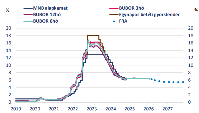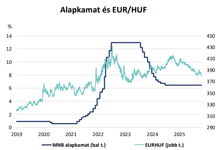 Így tehát 2026 végére 6,00%-os alapkamat lehet reális idehaza, amely 2027-ben tovább csökkenhet. A 6,00%-os alapkamat még mindig relatíve magas lenne a régióban és a dollár is tovább gyengülhet a várható tengerentúli kamatcsökkentések miatt. Így a forint vonzerejét nem rontanák érdemben a jövő évi kamatcsökkentések, amivel 2027 végére 5%-ra kerülne az irányadó ráta.