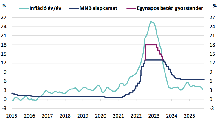 Úgy gondoljuk, hogy az MNB már közel lehet az első kamatcsökkentéshez, de februárban még várhatóan kivár a Monetáris Tanács. Ugyan az infláció már közelít a célértékhez és az első hónapokban 3% alatti számokat láthatunk majd, de a szolgáltatások áremelkedése továbbra is magas. Azt gondoljuk, hogy legalább a márciust megvárja az MNB az első kamatcsökkentéssel. Ekkor már bővebb adathalmaz áll majd rendelkezésükre mind az inflációt, mind az inflációs várakozásokat tekintve. Utóbbinak az alakulása különösen mérvadó lehet a kamatcsökkentés szempontjából a sajtótájékoztatón elhangzottak alapján. A márciusi kamatvágás a piacokat sem lepné meg, így várhatóan a forint is jól állná a sarat. Arra számítunk, hogy ezt követően júniusban jöhet még egy vágás, melyet néhány hónap kivárás követhet. Ezt főleg az indokolja, hogy az év második felében még az árrésstopok fennmaradása esetén is magasabb lehet az infláció, amelyet a kormányzati intézkedések keresletélénkítő hatása is megdobhat.