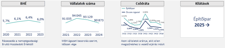 • 2025 második felében már érezhető élénkülésre számítunk, mindezt támogatja, hogy az Új Gazdaságpolitikai Akcióterv 21 pontja közül 10 kapcsolódik a lakáspiachoz és építőiparhoz, mely által a szektor egy lendületet kaphat, ami a jelenlegi trendből való kilábaláshoz szükséges (friss információk alább, az alágazati kilátásoknál találhatók). Az épületek felújításának anyagigénye miatt a gyártók kapacitáskihasználtsága javulhat, ill. az építési vállalkozók megrendelésállománya és munkaerőigénye is növekedésnek indulhat, leginkább a KKV szektorban. A korábban kibocsátott magas kamatozású állampapírok utáni kamatkifizetések, illetve a lejáratok és visszaváltások pedig az ingatlanpiac felé terelheti a befektetéseket, ami szintén élénkítően hathat az építőiparra. Ugyanakkor az ágazat helyzetét a pénzügyi források alacsony szintje nehezíti az EU támogatások hiánya miatt, így az állami és önkormányzati beruházások is csak korlátozott volumenben tudnak megvalósulni.