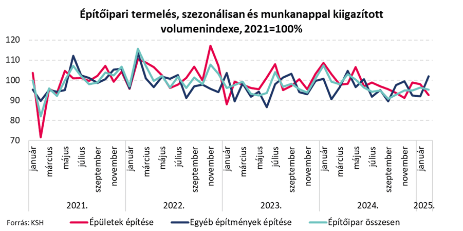 A januári pozitív hírek után az év második hónapjában újra visszaesést láthatunk. Februárban a termelés volumene 1,3%-kal alulmúlta a januárit, és éves szinten is csökkenést mutatnak az adatok: az építőipar termelése 4,5%-kal elmaradt az egy évvel korábbitól. A rendelési mutatók se teljesítettek jól, a megkötött új szerződések volumene is elmaradt a 2024 februárhoz képest, ugyanakkor pozitív, hogy a szerződésállomány 1,8%-kal magasabb az egy évvel korábbinál. Az ágazatot 2025 második felétől egyre erősebben megtámaszthatják az Új Gazdaságpolitikai Akcióterv építőipart és lakáspiacot érintő intézkedései, azonban a kilátások szempontjából az uniós források akadozása, a nagy állami beruházások elhalasztása és a gazdasági szereplők borús jövőképe miatti kapacitás bővítések visszafogása negatív tényező.