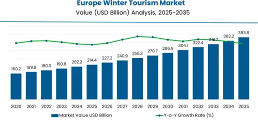 A Future Market Insights előrejelzése szerint az európai téli turizmus piaca 2025-ben eléri a 214,4 milliárd USD-t, és 2035-re várhatóan meghaladja a 380 milliárd USD-t, évi mintegy 6%-os átlagos bővüléssel. A növekedést az alpesi régiók folyamatos infrastruktúra-fejlesztései, a havas sportok iránti tartós kereslet, valamint a digitális foglalási platformok térnyerése hajtja.
