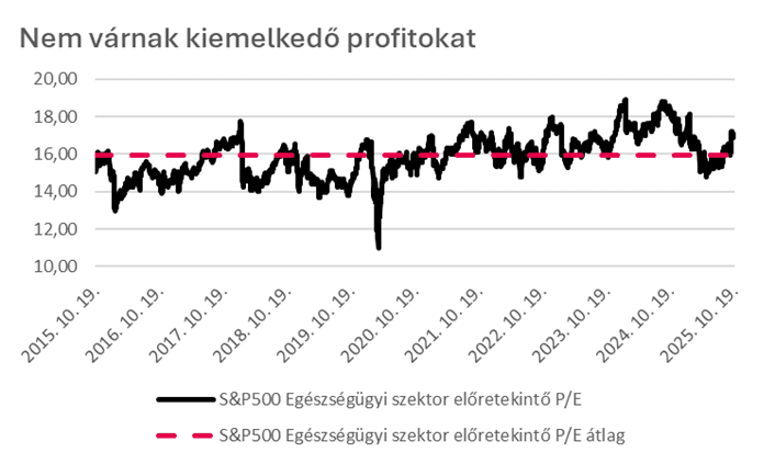 A befektetői fókusz eltolódott a stabilitásról a katalizátorokra. A döntésekhez ezért nemcsak pénzügyi, hanem politikai és jogi érzékenység is szükséges. Az egészségügyben ma már nem elég a fundamentális kereslet: az árfolyamokat az FDA-engedélyek, jogi viták, IRA-végrehajtás és MA-bónusz ciklusok mozgatják. A szektor értékeltsége diszkontos a legtöbb szektorhoz képest, ugyanakkor saját történelmi szintjeihez viszonyítva enyhe prémiumon forog (előretekintő P/E alapján). Ez azt jelzi, hogy bár relatíve olcsónak tűnhet, a gyenge eredménydinamika miatt ez nem automatikus vételi jelzés. A kockázatok továbbra is jelentősek, így a befektetői bizalom csak fokozatosan épülhet vissza.