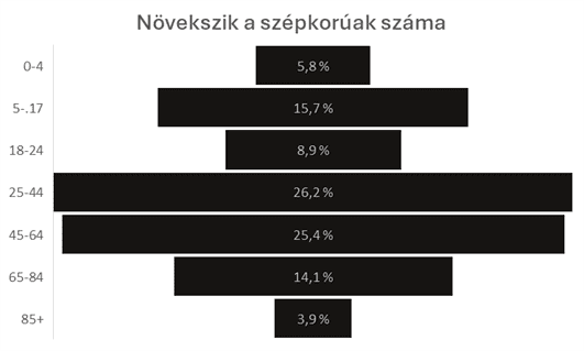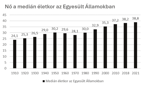 Az amerikai korfa és a medián életkor alakulása vizuálisan is megerősíti ezt a trendet. A felmérések szerint a 65–84 éves korosztály létszáma 2,8%-kal, míg a 85 év felettieké 4,2%-kal nőtt 2023-hoz képest, miközben a legfiatalabb (0–4 éves) csoportban 0,5%-os csökkenés volt tetten érhető. A medián életkor emelkedése pedig azt mutatja, hogy az amerikai társadalom öregedése, több mint egy évszázada velünk van. Az 1910-es évekhez képest 50%-kal nőtt a medián életkor, 24,1-ről 38,8 évre 2021-re.
