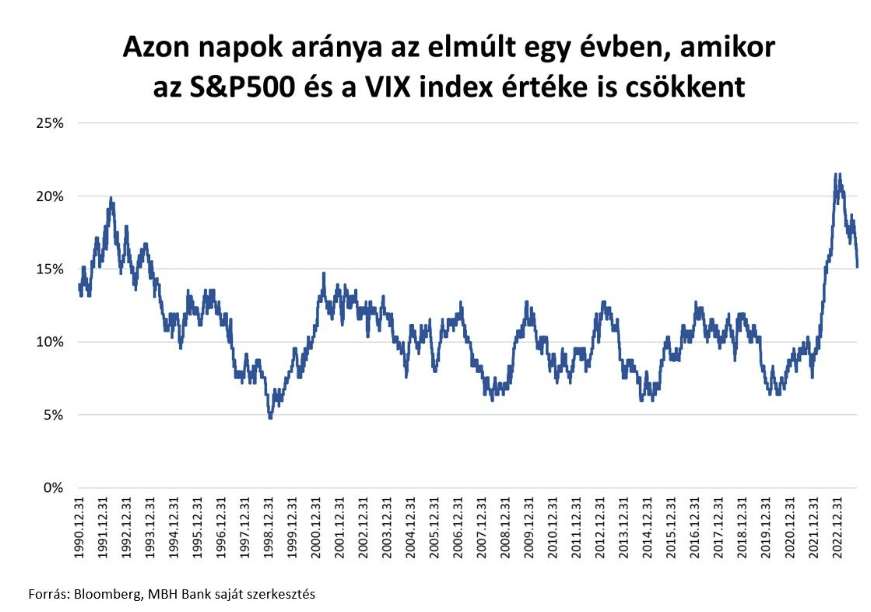 Van olyan helyzet, hogy a részvénypiac esik, és egyúttal a volatilitás indexe is csökken. Ez alapvetően ellentmondana a piacok működésének, de átlagosan az esetek 10-11 százalékában mégis megfigyelhető. De az elmúlt két évben volt olyan pont, hogy ez az arány 22 százalékra nőtt. Vagyis a kereskedési napok ötödében mind a részvényindex, mind a volatilitás esett.