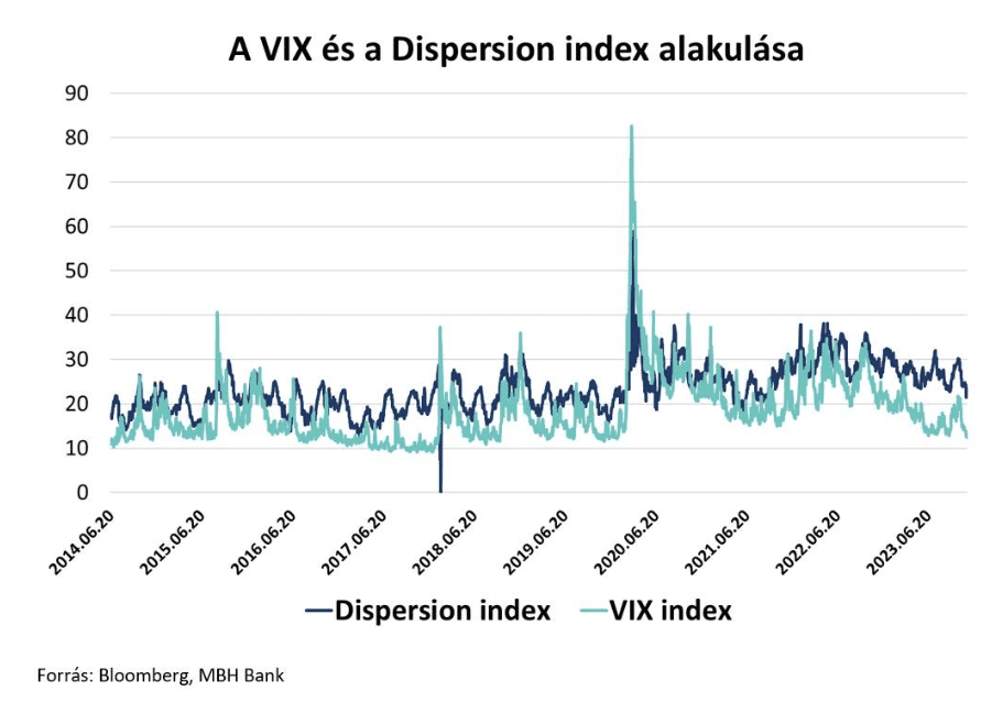 A CBOE Dispersion indexe, amely azt mutatja meg, hogy az S&P500 indexet alkotó egyedi részvények hozamai várhatóan mennyire fognak eltérni egymástól az elkövetkezendő 30 napban, éppen csökkenő trendben van, ahogy a VIX is. Ez pedig azt jelenti, hogy sem szisztematikus, sem egyedi kockázatot nem áraznak a befektetők. Ha a VIX index emelkedik, de a Dispersion index nem, akkor szisztematikus, ellenkező esetben egyedi kockázatot áraznak a kereskedők.