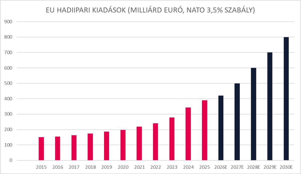 És hogy honnan jön ez a növekedés? A NATO 2025-ös hágai csúcstalálkozójáról, ahol a 32 tagállam vezetői megállapodtak abban, hogy 2035-ig a GDP legalább 3,5%-át fordítják alapvető védelmi szükségleteikre, 1,5%-ot pedig a kritikus infrastruktúrákra, a hálózatok védelmére és a polgári védelmi készültségre. Hogy ezen kiadásoknak a jövőben milyen lesz az összetétele, azt ma még nehéz megmondani és nem gondoljuk, hogy egy statikus növekedési pályával állunk szemben. A világ változásával a védelmi ipar is változni fog. Ezen felül sok országban a hadiipari kiadást növeli például a veteránoknak járó juttatás, míg máshol nem. Természetesen ez az összeg valószínűsíthetően nem jelentős tétel, de érzékeltetheti, hogy milyen jogcímeken múlhatnak a kiadások.