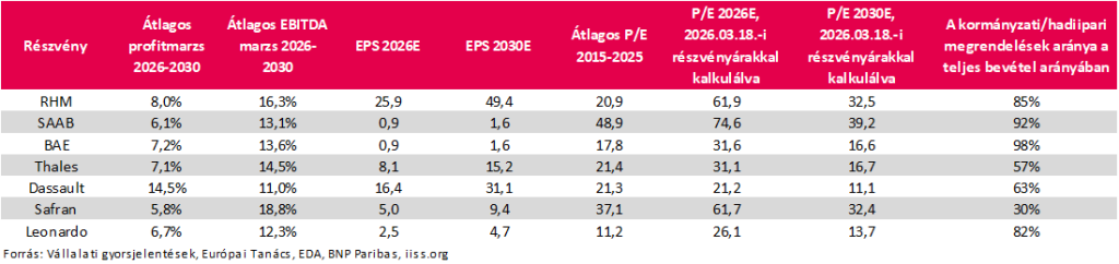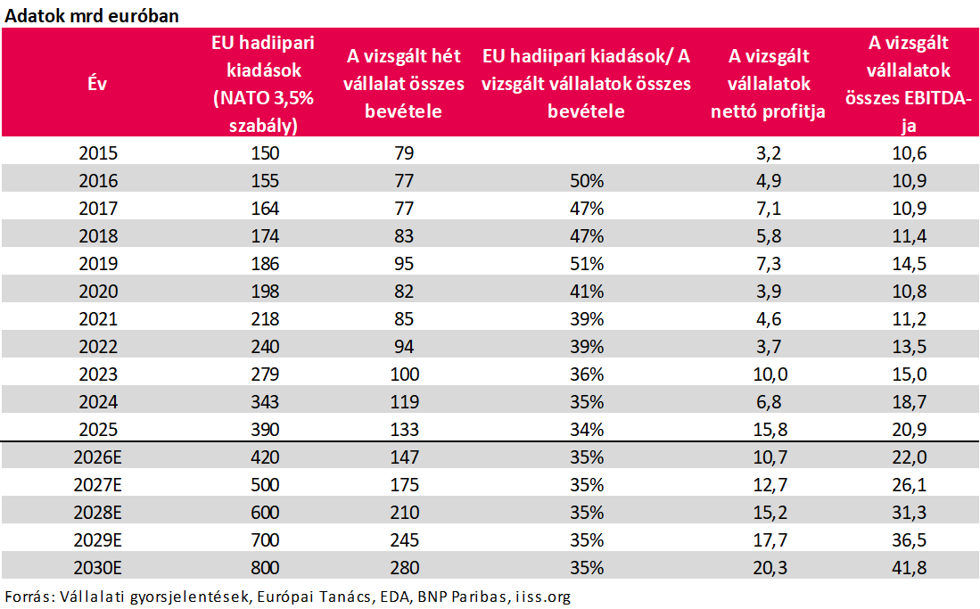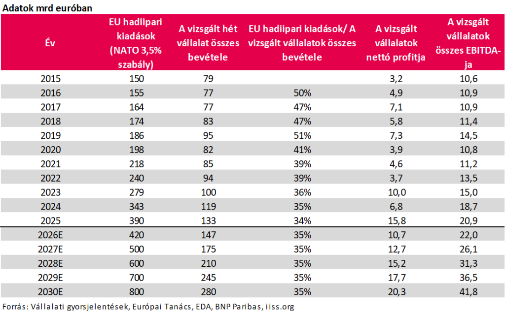 2030-ra az EU hadiipari kiadásai elérhetik a 800 milliárd eurót (2025-ben kb. 343 milliárd euró), míg a vizsgált hét vállalat összes árbevétele 280 milliárd euró lehet (2025-ben 133 milliárd euró), azaz ők felelhetnek a teljes EU hadiipari kiadás kb. 35%-áért. Ez az arány körülbelül a 2021-2025-ös éveket idézi és a cégek menedzsmenti előrejelzéseit tanulmányozva 2026-ban ez nem is fog változni. Néhány cég hosszabb távú előrejelzést is közzétett és abban sem látni lényeges eltéréseket a 2020-as években kialakult arányokat illetően.
