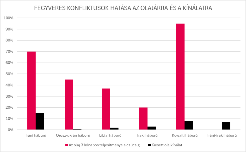 Az elmúlt két-három hétben a napi kb. 100-105 millió hordó olajból csak 80-85 millió éri el végcélját, ez pedig 15-20%-os csökkenés. A 2022-es orosz-ukrán háború alatt a globális olajkínálat mindössze 1%-át érintette konfliktus, miközben az olaj ára több, mint 40%-kal emelkedett; de lentebb látható, hogy számos esetben sokkal kisebb olajkínálati/kitermelői sokkra, az olaj ára, relatív, jobban emelkedett.
