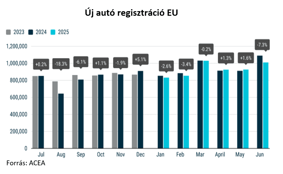 • Az EU autópiacán az év első felében összességében 1,9%-kal estek vissza az eladások az előző év azonos időszakához képest az ACEA adatai alapján. Gyakorlatilag két éve stagnál az EU autópiaca, és továbbra is jelentősen kevesebb autót vesz fel a piac, mint 2020 előtt. A tisztán elektromos, akkumulátoros járművek (BEV) piaci részesedése 2025 első felében elérte a 15,6%-ot, ami javulást mutat a 2024-es 12,5%-os részesedésről. A legnépszerűbb hibrid-elektromos hajtású járművek a piac 34,8%-át uralják. A plug-in hibridek is lendületet kaptak és 8,4%-os részesedéssel rendelkeznek szemben az egy évvel korábbi 6,9%-kal. A hagyományos hajtásláncok látványos visszaesést szenvedtek el. A benzinmotoros autók, piaci részesedése 28,4%-ra esett az egy évvel korábbi 35,4%-ról, a dízelek még inkább: az év első felében piaci részesedésük 9,4%-ra zsugorodott.