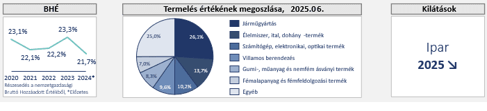 Az ipar továbbra is gyenge számokat produkál: júniusban az ipari termelés volumene 4,9%-kal maradt el az egy évvel korábbitól. A szezonálisan és munkanappal kiigazított adatok alapján az ipari kibocsátás 1,2%-kal kisebb volt a 2025. májusinál. Az első félévben kumuláltan 3,9%-os volt a csökkenés év/év alapon. A gyenge teljesítmény elsődleges oka a nem kielégítő külső kereslet, ami ráadásul a legnagyobb alágazatokat, a járműgyártást, illetve a villamos berendezés gyártást (akkumulátor-gyártás) kiemelten érinti. A német gazdaságélénkítő csomagnak pozitív hatása lehet az ágazatra, továbbá támogathatná az ipar helyzetét és csökkenthetné a bizonytalanságot az orosz-ukrán háború lezárása. Némileg mérsékli a továbbra is gyenge külpiaci konjunktúra hatásait és szintén támogathatják az ipari kibocsátás javulását 2025 végétől, de inkább 2026-tól azoknak a gyáraknak a beindulása, amik az elmúlt években az autó- és akkumulátoripari szegmensben felépültek, miközben csak évek alatt érik majd el kapacitásaik felső határát. Összességében viszont arra számítunk, hogy 2025-ben az ipar teljesítménye várhatóan éves átlagban még visszaesik.