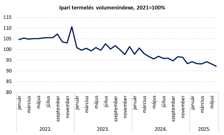 • 2025 júniusában az ipari termelés volumene 4,9%-kal maradt el az egy évvel korábbitól (munkanaphatástól megtisztítva megyezik a kiigazítatlannal).