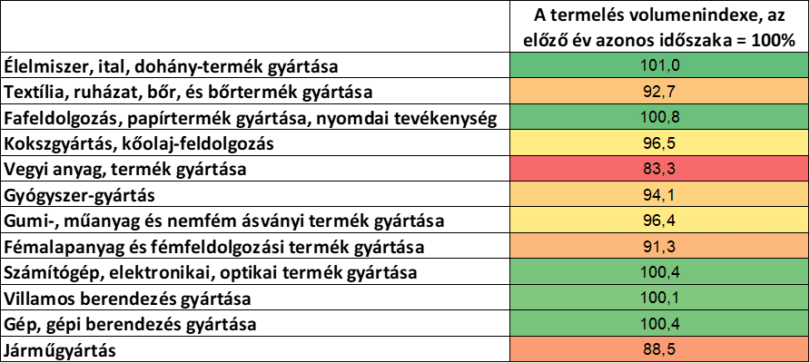 • A feldolgozóipari alágak többségében visszaesett a termelés, a legnagyobb mértékben a vegyi anyag, termék gyártásban. A legnagyobb súlyú, a feldolgozóipari termelés 26%-át képviselő járműgyártás volumene 11,5%-kal visszaesett az előző év azonos hónapjához képest, míg a 9,6%-os feldolgozóipari súlyú villamos berendezés gyártása 0,1%-kal emelkedett az egy évvel korábbihoz viszonyítva.