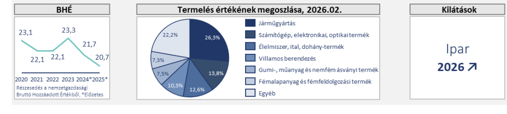 A decemberi és januári növekedés (1%, ill. 1,5%) után februárban ismét visszaesett a hazai ipar teljesítménye. Havi alapon 1,8%-kal csökkent a termelés volumene, éves alapon pedig 1,5%-kal. Az alágak közül éves alapon a számítógép, elektronikai, optikai termék gyártása, illetve a villamos berendezés gyártása bővült, ugyanakkor a járműgyártásban, valamint az élelmiszeriparban visszaesés következett be. Meglepően jó képet mutatnak viszont a rendelési és az export adatok: az összes rendelésállomány február végén 24%-kal meghaladta az egy évvel korábbit, amihez a járműgyártás járult hozzá leginkább. Várhatóan az ágazat 2026 első negyedévében érdemben nem fog tudni hozzátenni a GDP növekedéshez, és rövid távon nem várható gyors felfutás. 2026-ban az ipar erősödése az elektromobilitásra épülő szegmensekben (pl. CATL, BYD kapacitások) remélhető, bár a német gazdaság élénkülése törékeny. Az ipari termelésben éves szinten mintegy 2,2%-os növekedésre számítunk, azonban a február végén kitört közel-keleti háború esetleges elhúzódása az ágazat szempontjából kockázatot jelent.