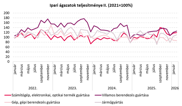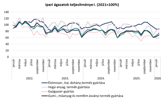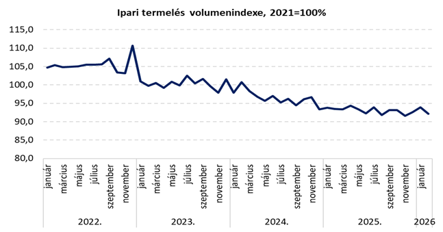 • 2026 februárjában az ipari termelés volumene 1,5%-kal elmaradt az egy évvel korábbitól. A munkanaphatástól megtisztított index megegyezik a kiigazítatlannal.